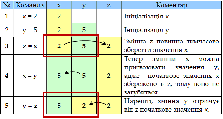 2. На відміну від математичного запису, у програмуванні важливою є послідовність виконання команд. Так, якщо, наприклад, поміняти місцями команди 3 і 4 або 4 і 5 в таблиці, то одне із вхідних значень буде втрачено.
